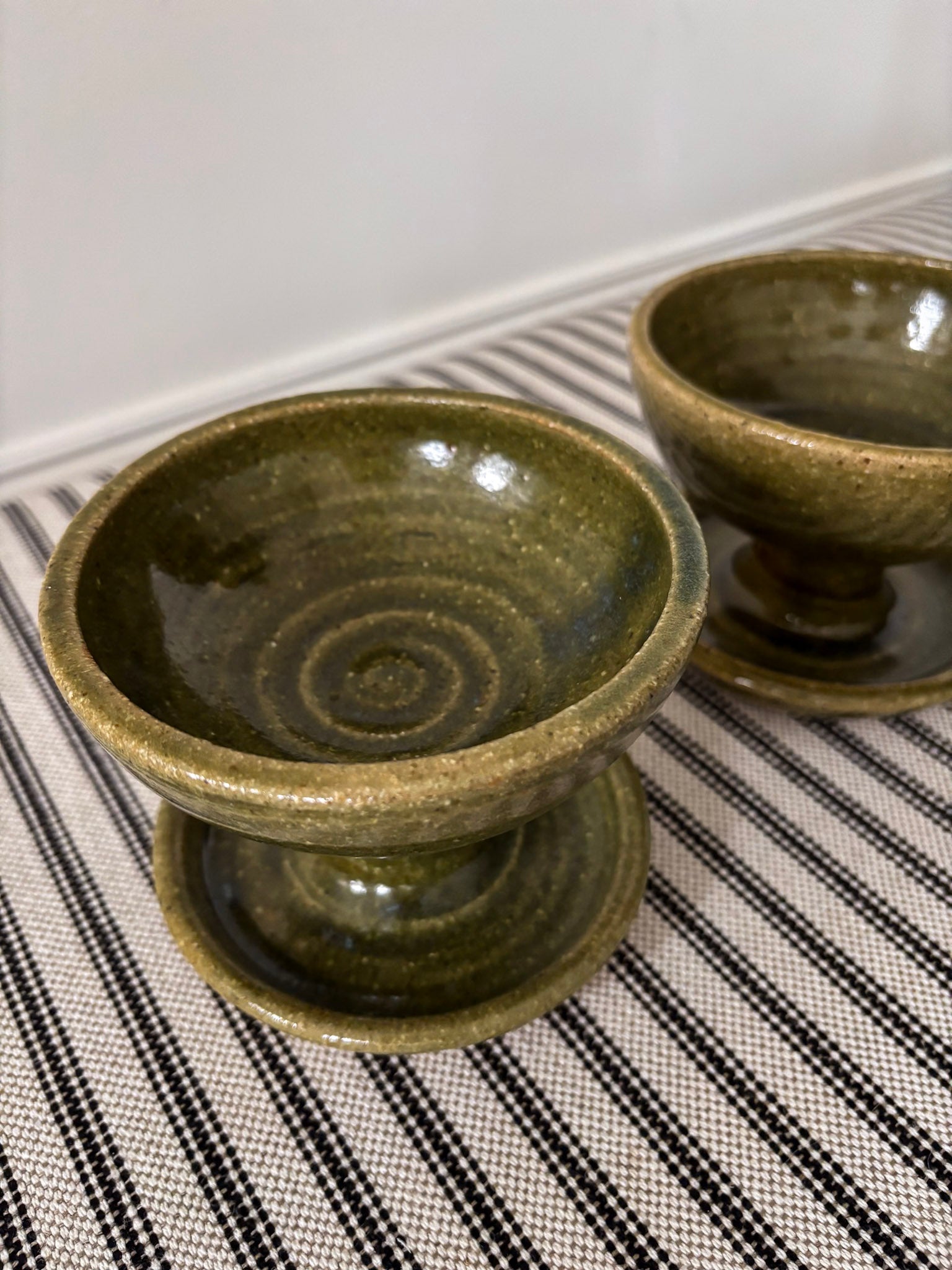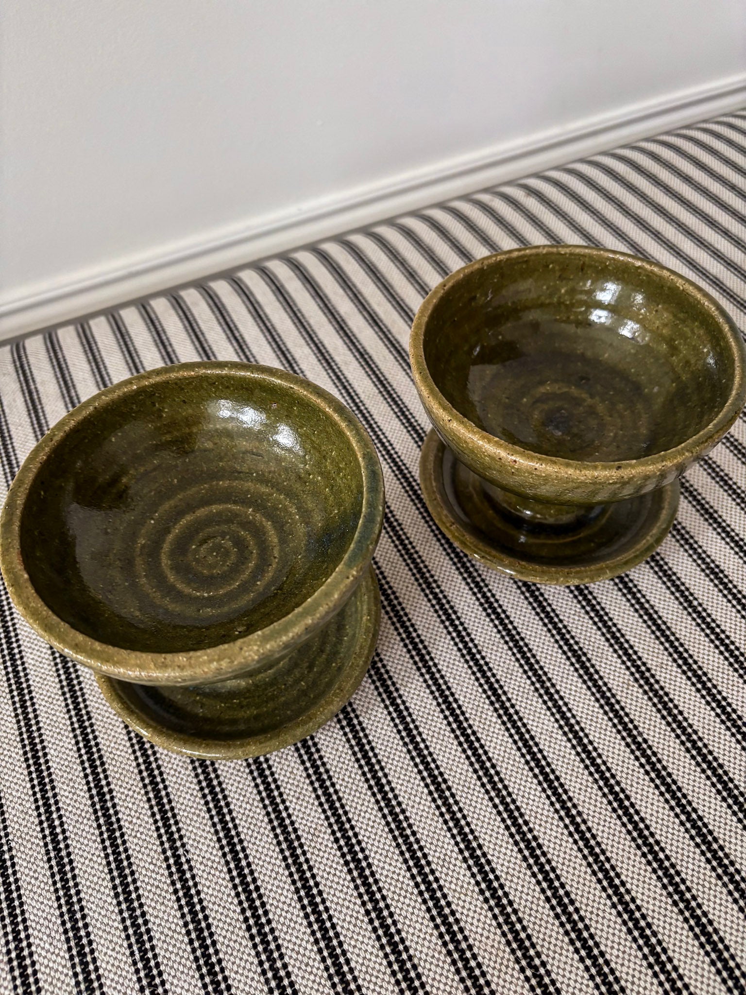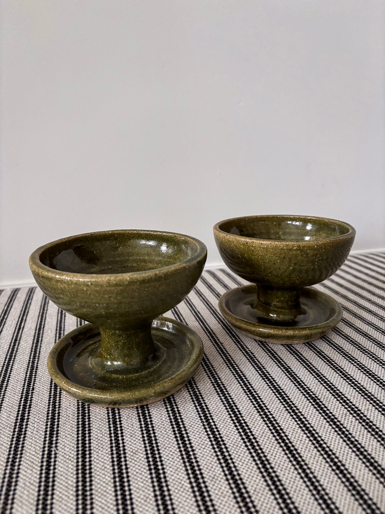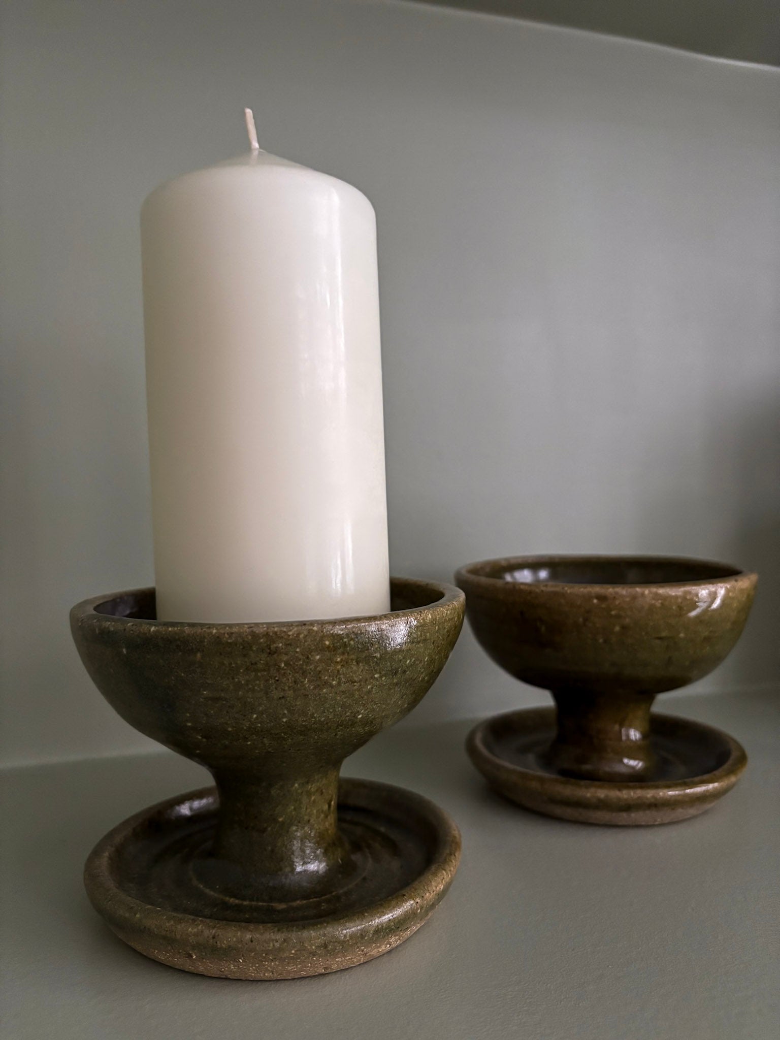 A small but striking pair, hand-thrown with a sculptural, pedestal base that feels both grounded and elevated. Finished in a rich olive glaze with gentle mottling, each holder catches the light in a way that gives real depth - somewhere between rustic studio pottery and quiet mid-century form.