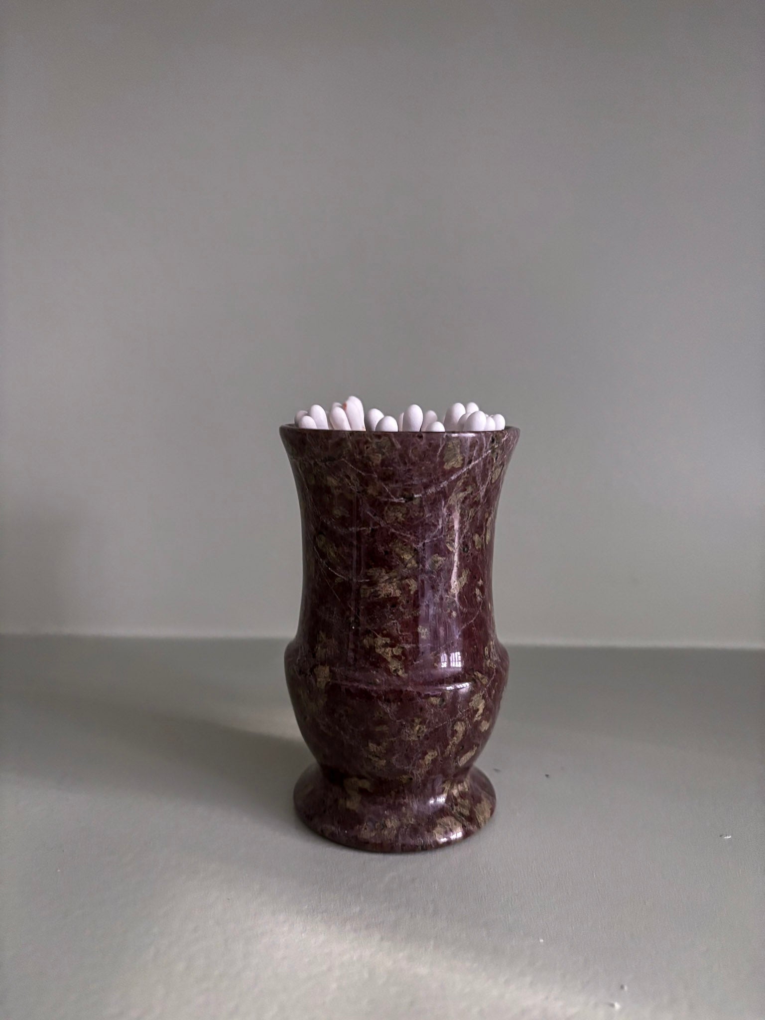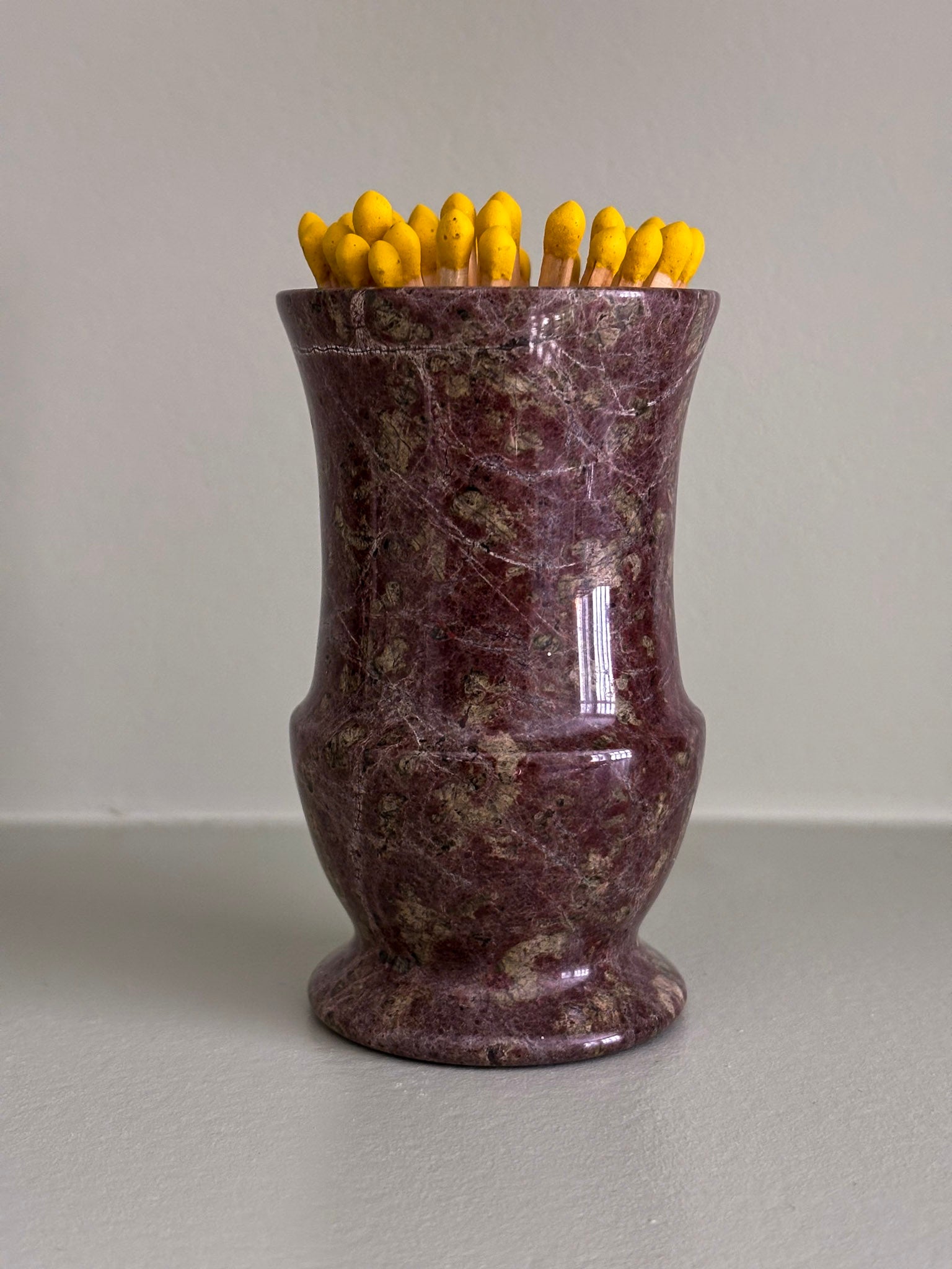 A beautifully shaped serpentine stone pot, now reimagined as a striking matchstick holder. Hand-carved from richly marbled serpentine stone, this piece brings depth, texture and quiet luxury to any surface.