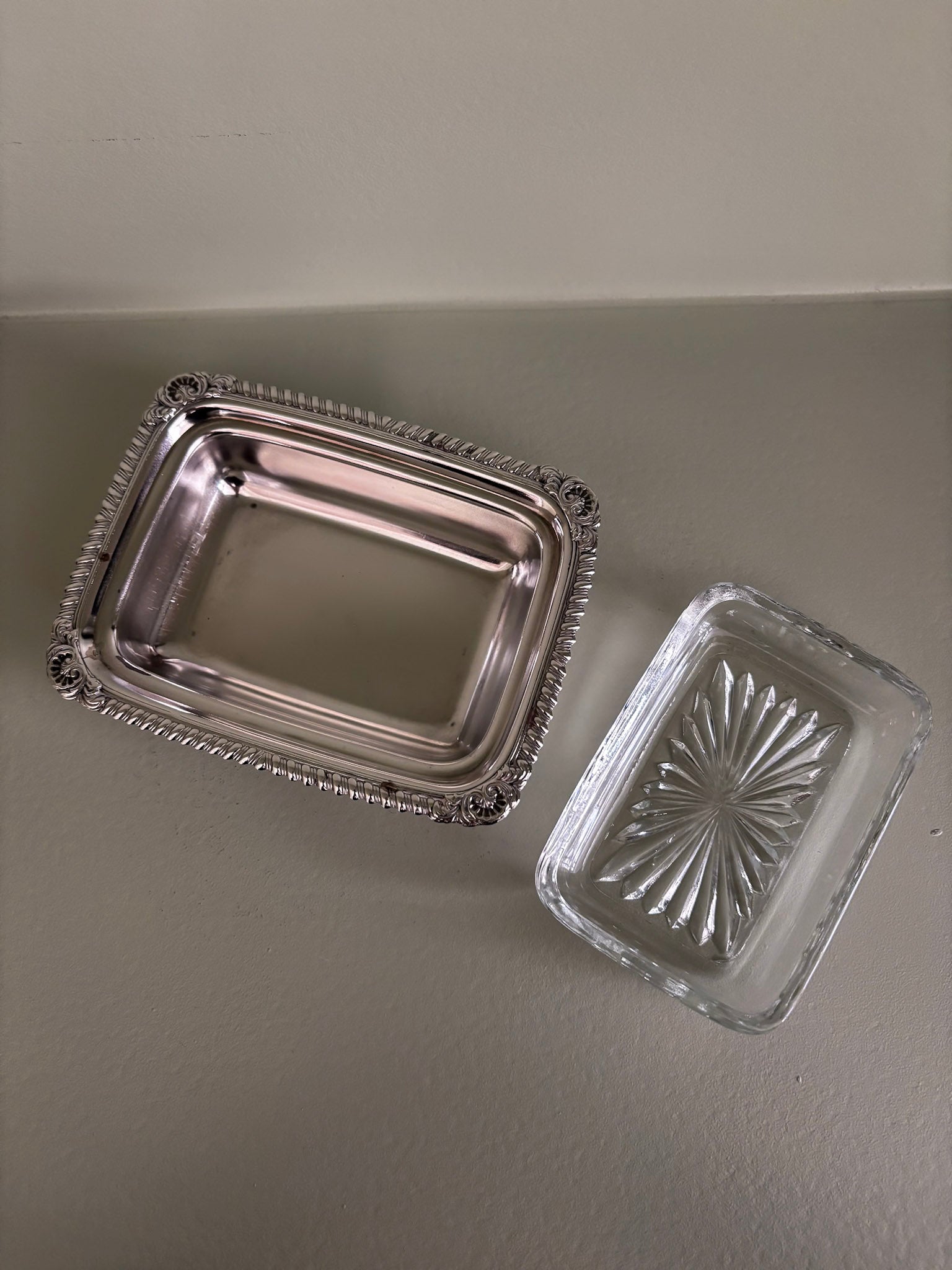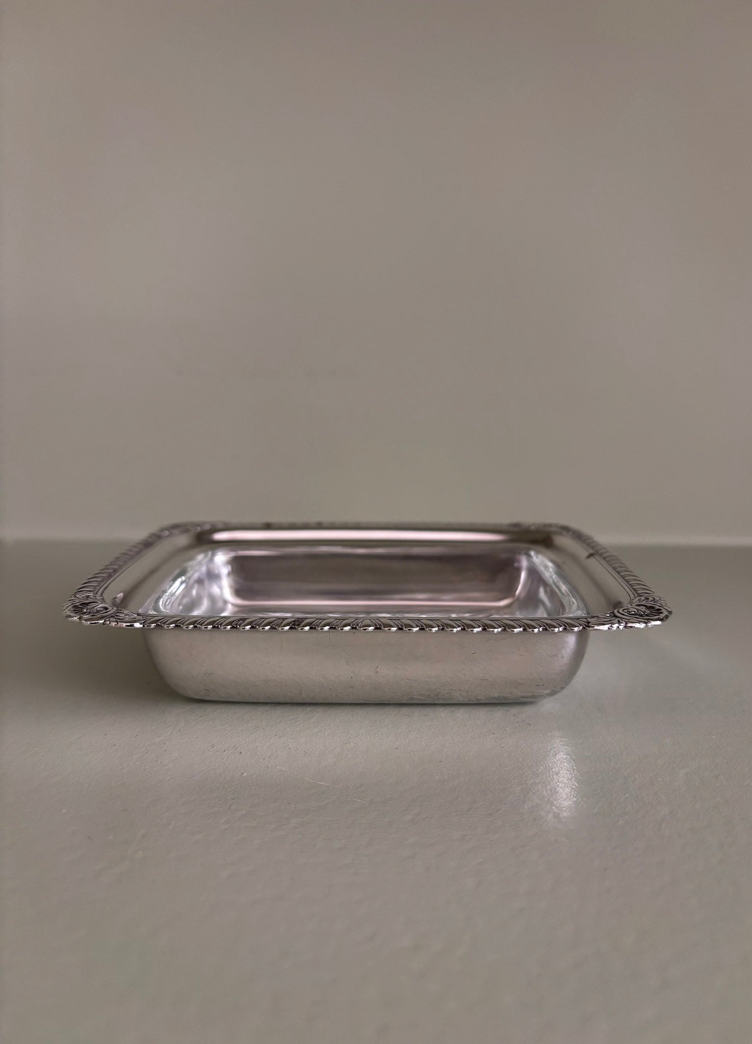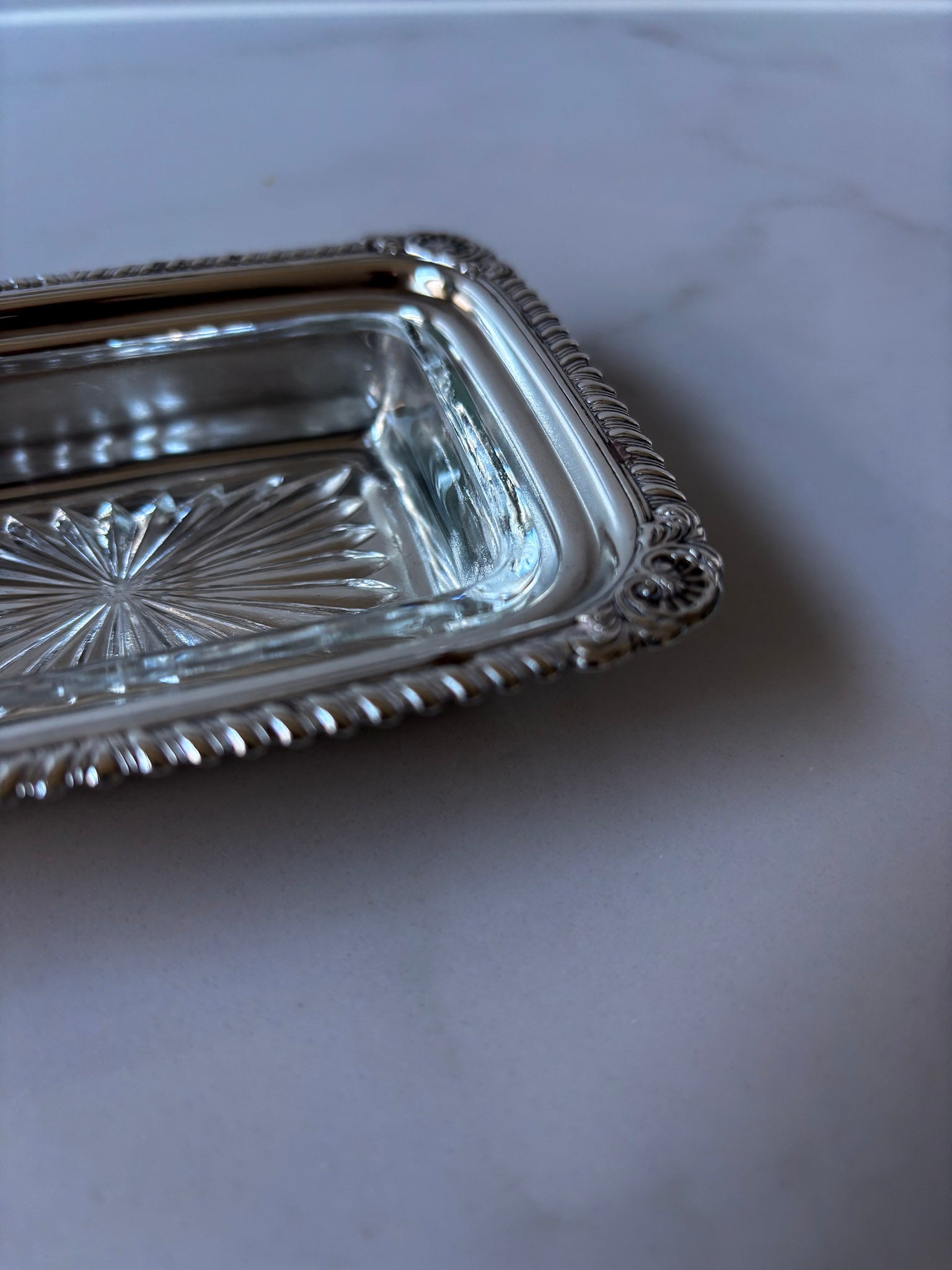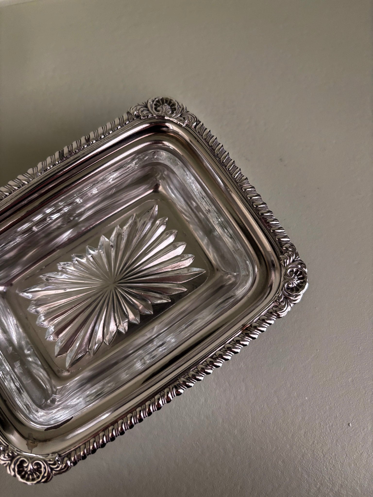 A beautifully detailed silver-plated soap dish featuring an ornate rope-and-scroll rim and its original cut-glass insert. The glass tray has a starburst pattern that catches the light, adding subtle elegance to any bathroom, kitchen sink, or vanity space.