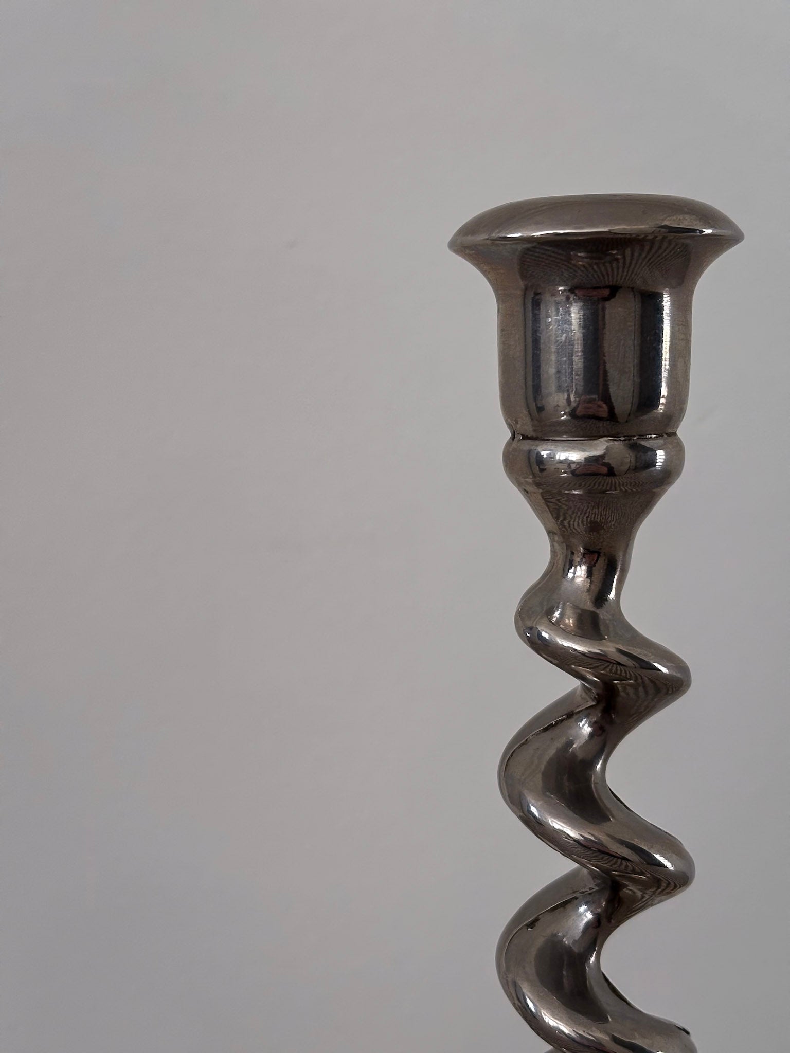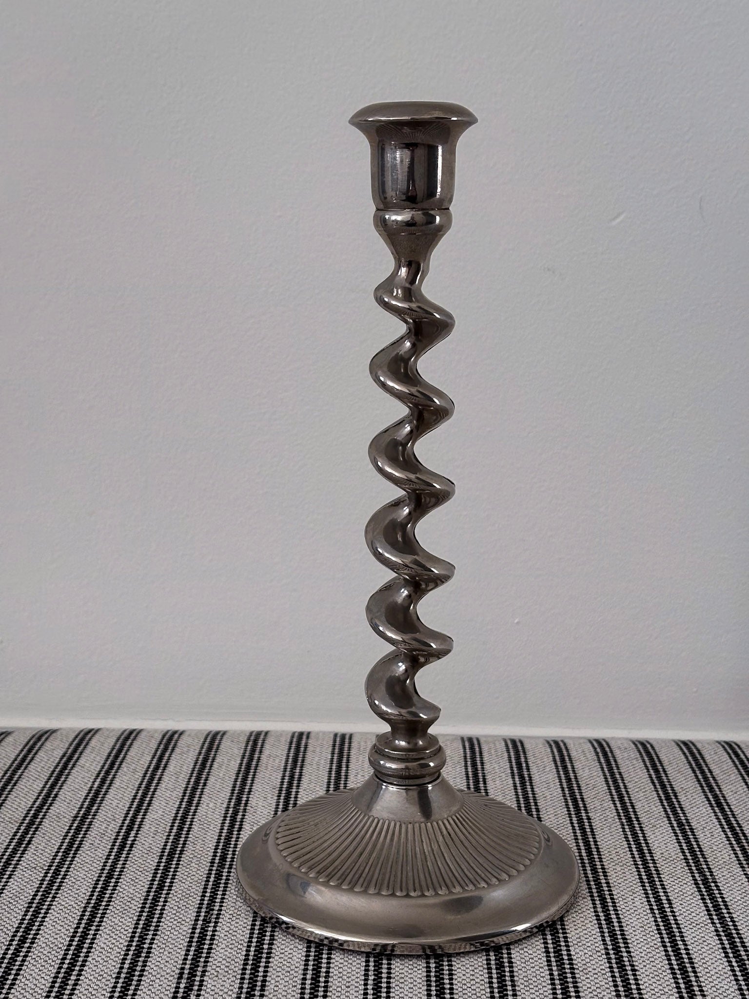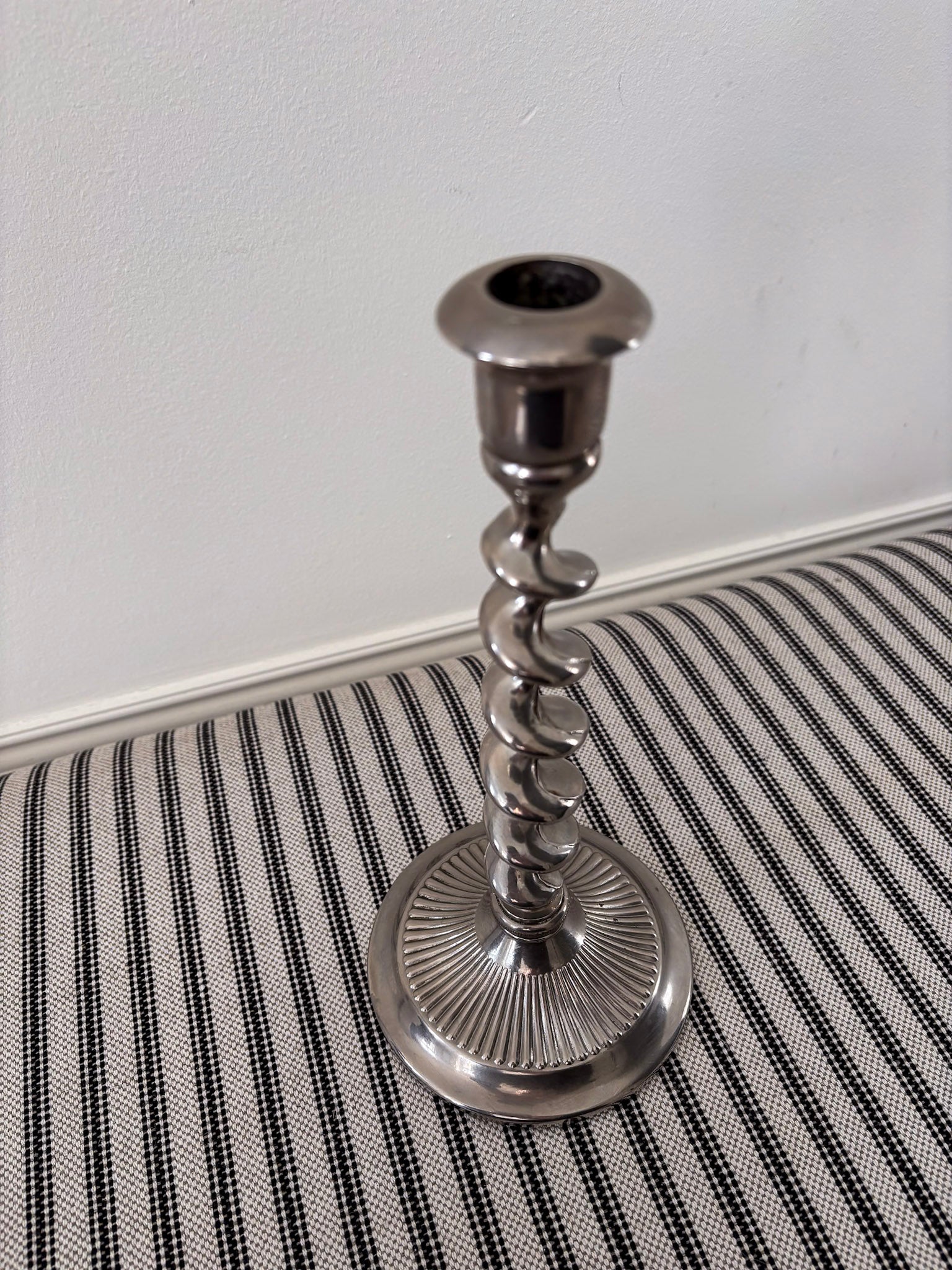 A vintage barley-twist brass candlestick finished in silver-plate, with classic detailing and strong vintage character. The twisting stem adds movement and elegance, while the silver-plating keeps the look modern and clean.