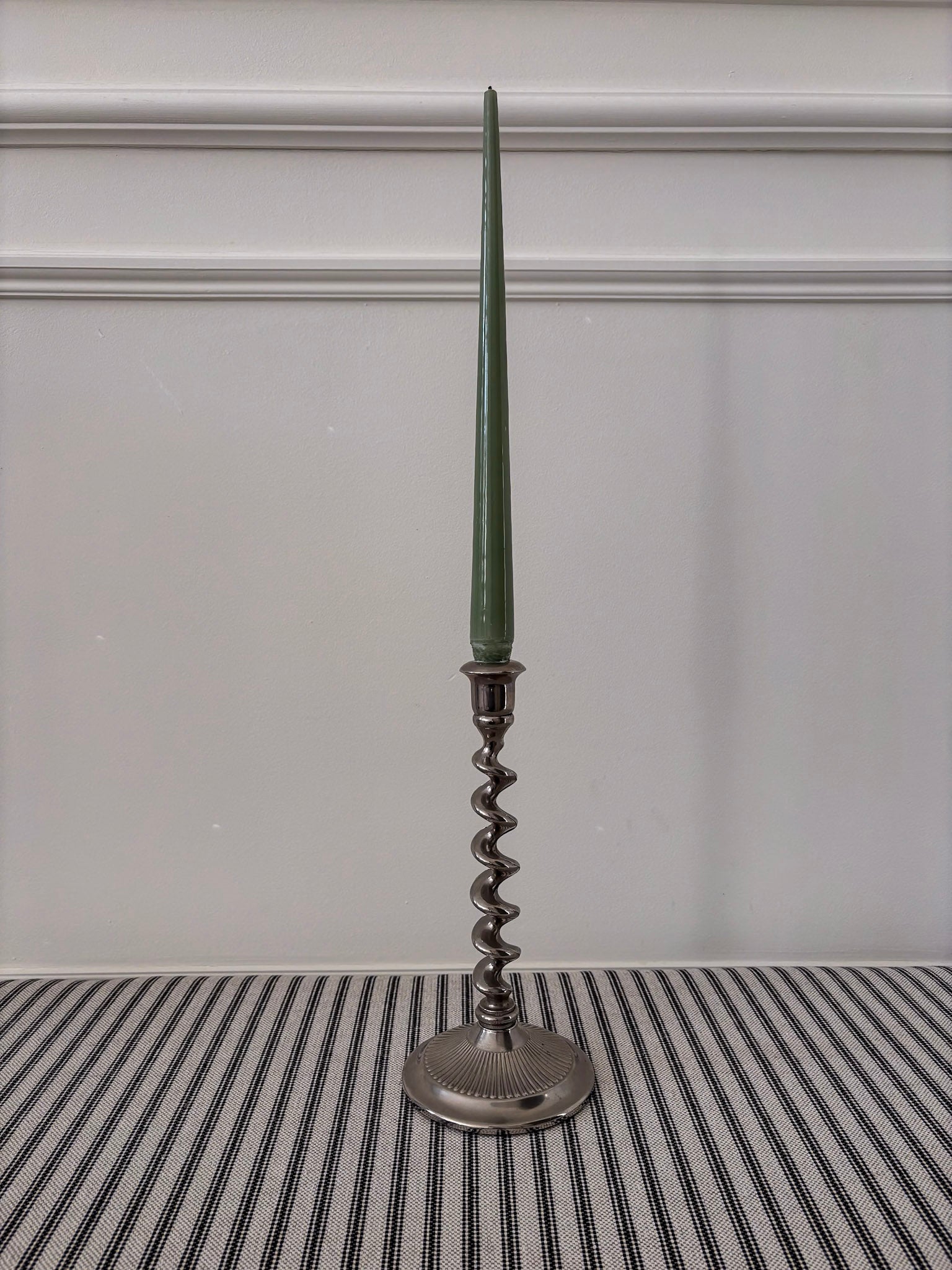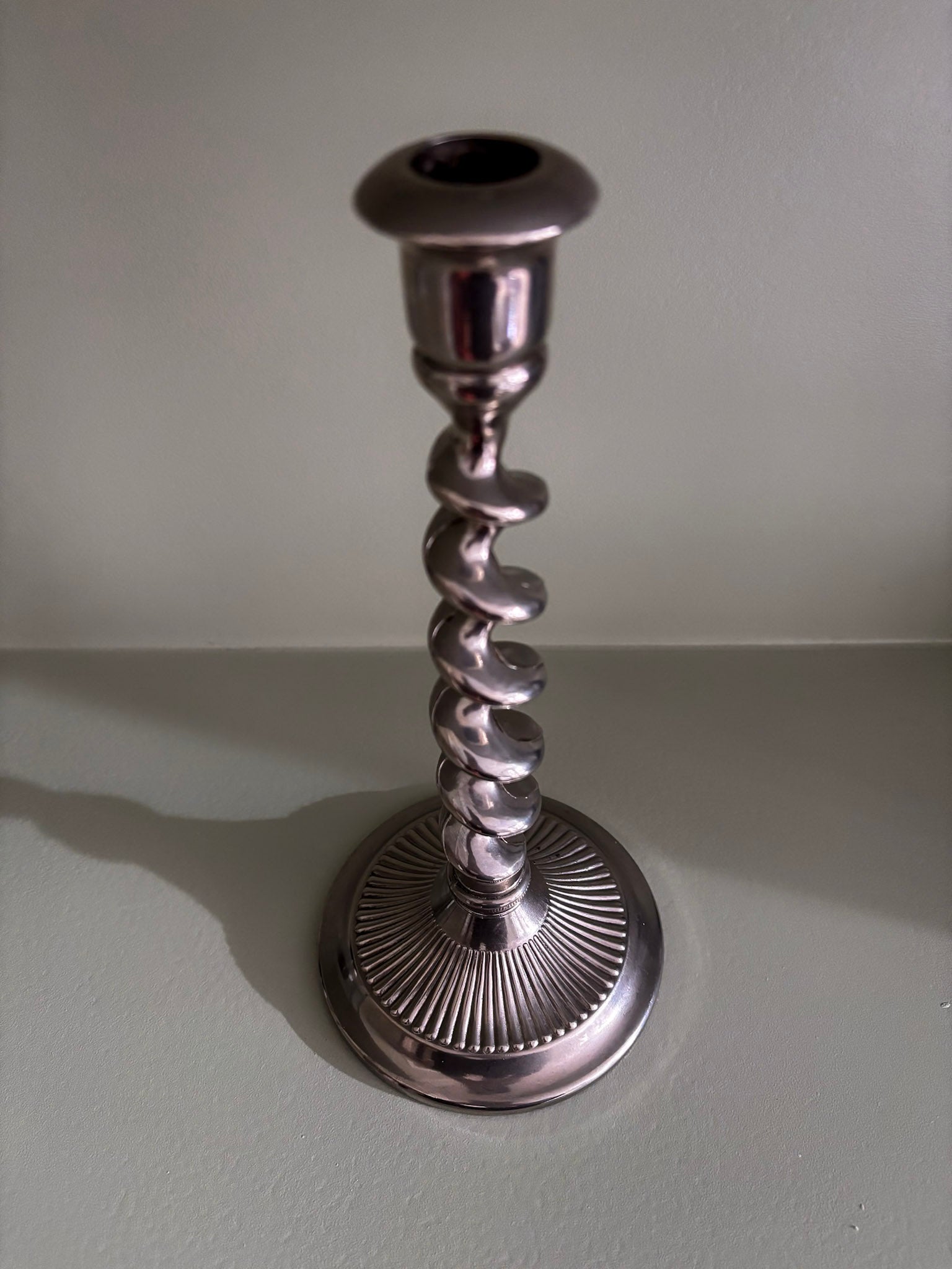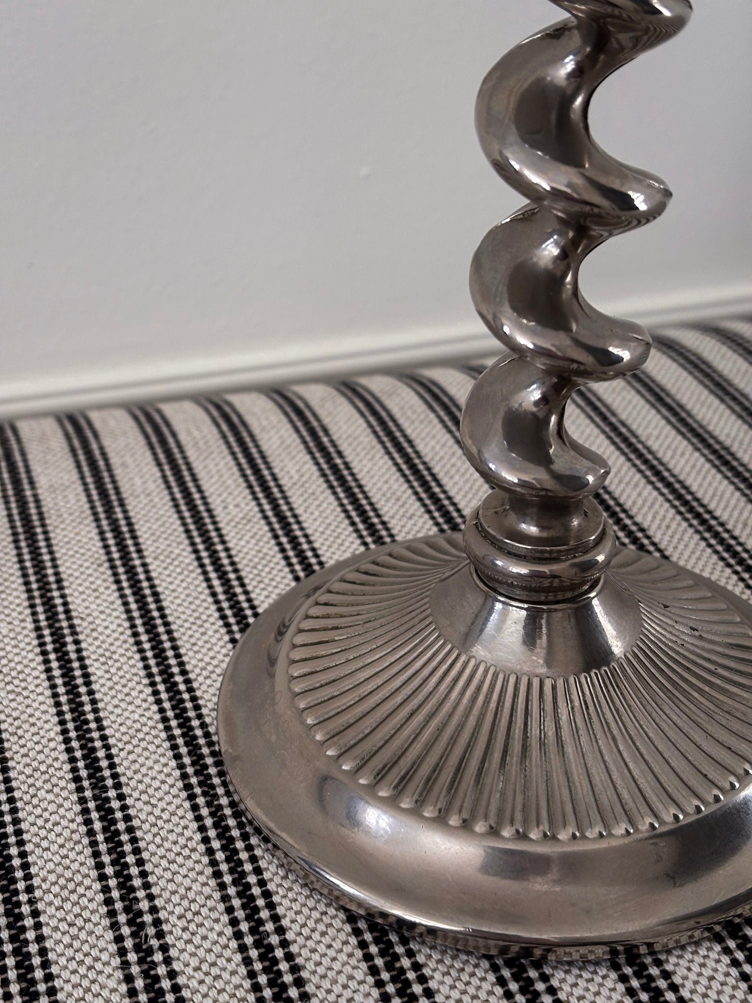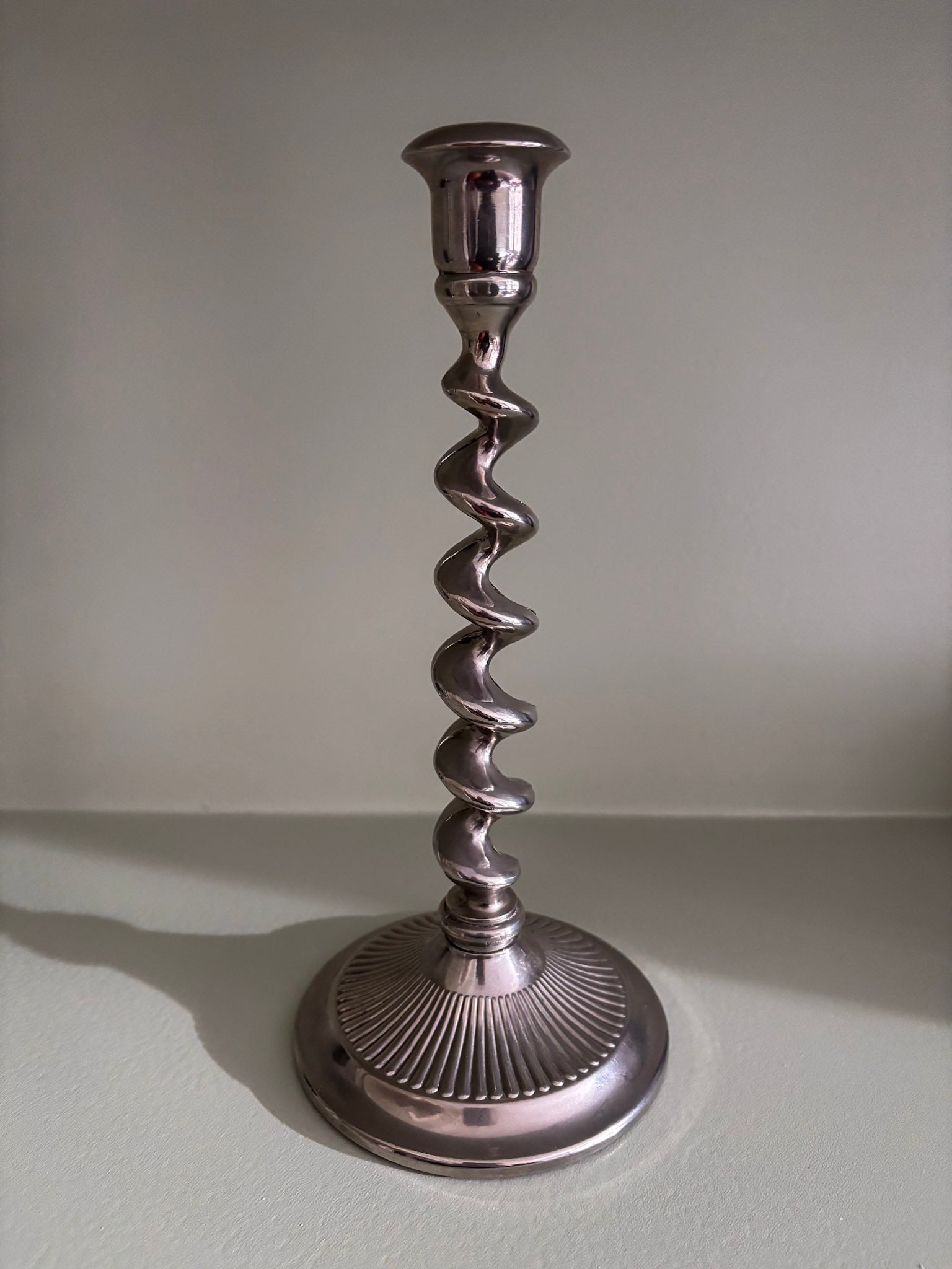 A vintage barley-twist brass candlestick finished in silver-plate, with classic detailing and strong vintage character. The twisting stem adds movement and elegance, while the silver-plating keeps the look modern and clean.