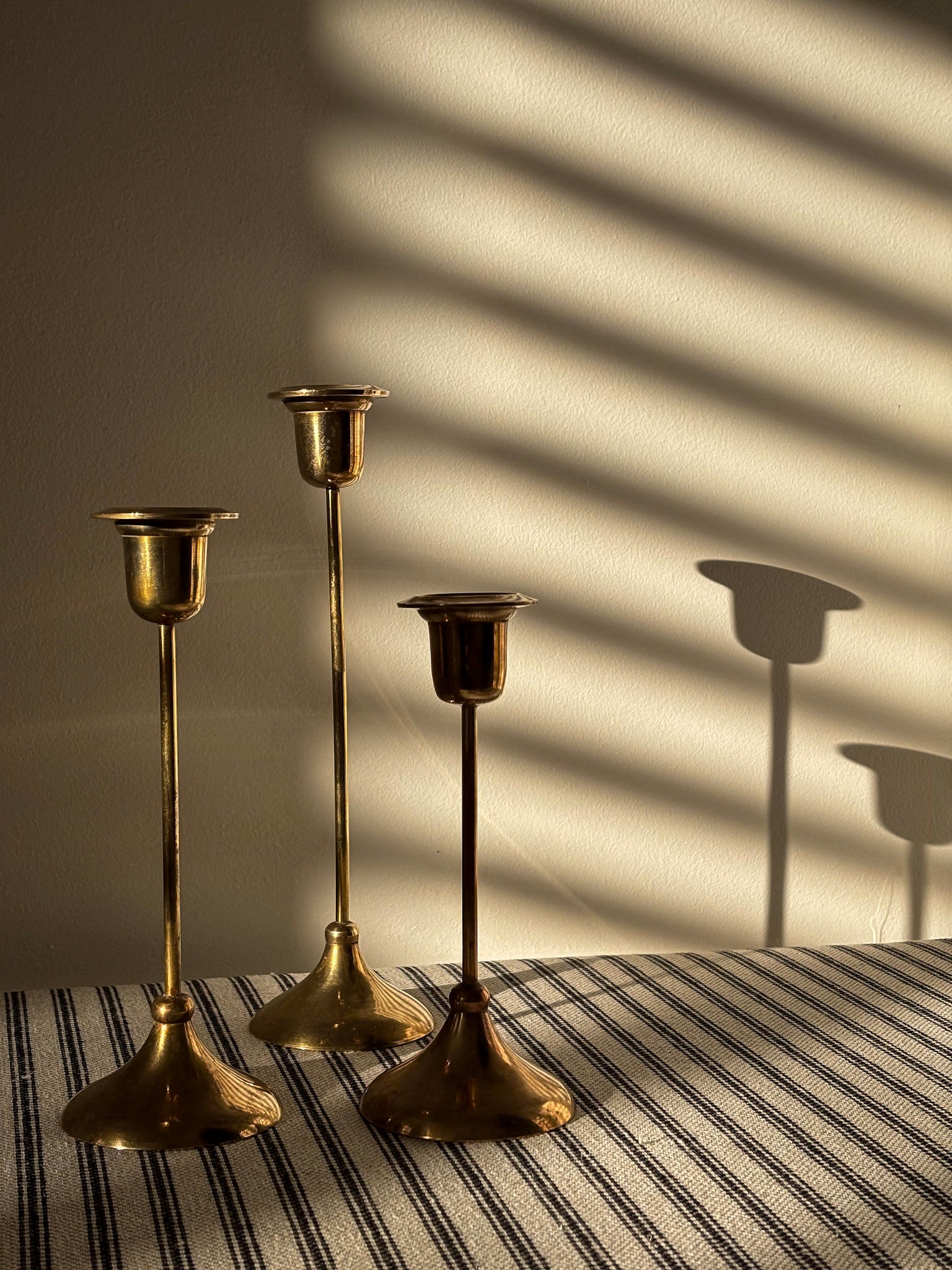 A curated trio of vintage brass candlesticks, one tall, one mid, one low. The varying heights create movement, the brass finish brings warmth, and the simplicity keeps things elevated.