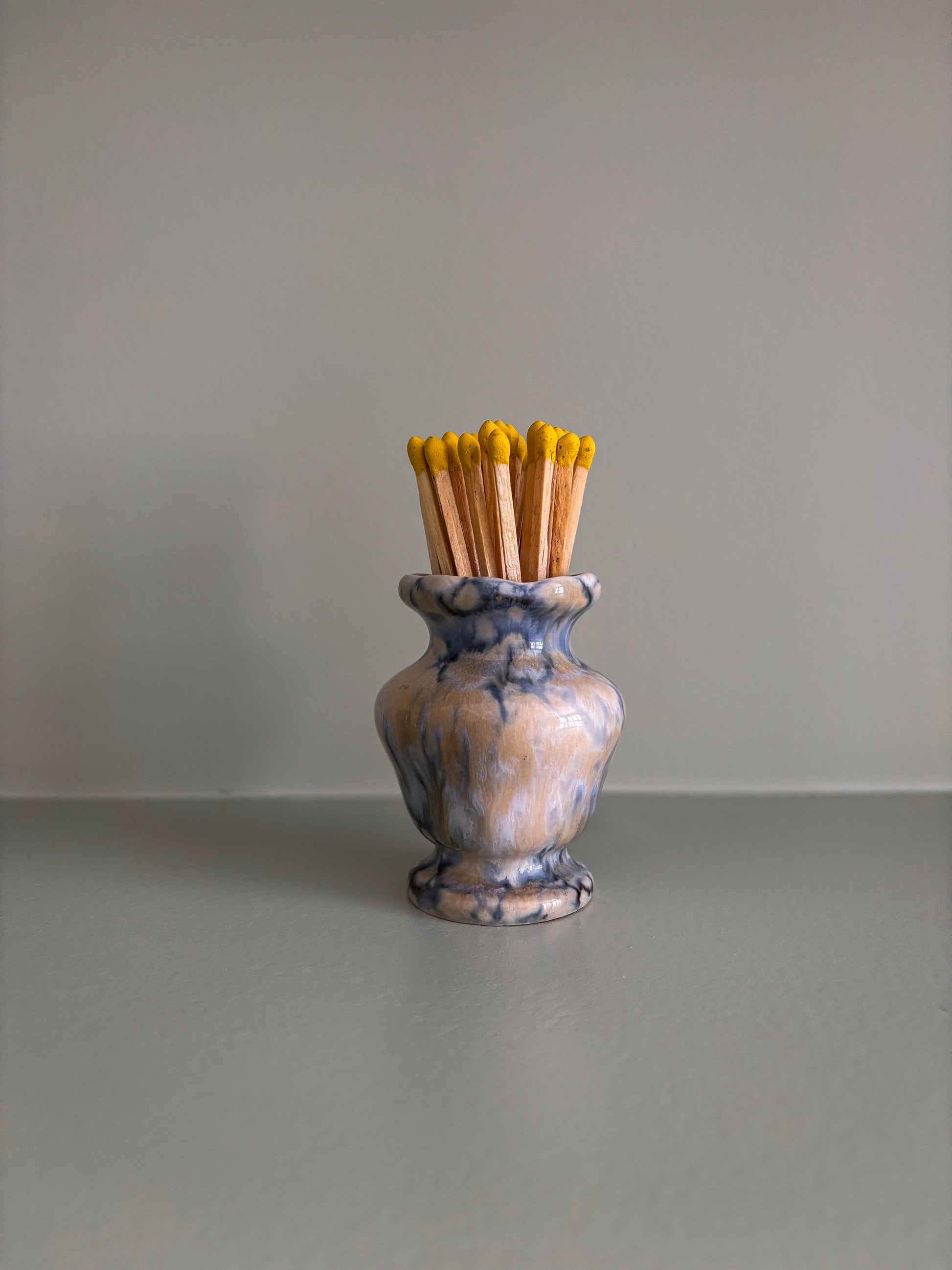 A small studio pottery vessel marked Pottery 572, reimagined here as a very cute matchstick holder.